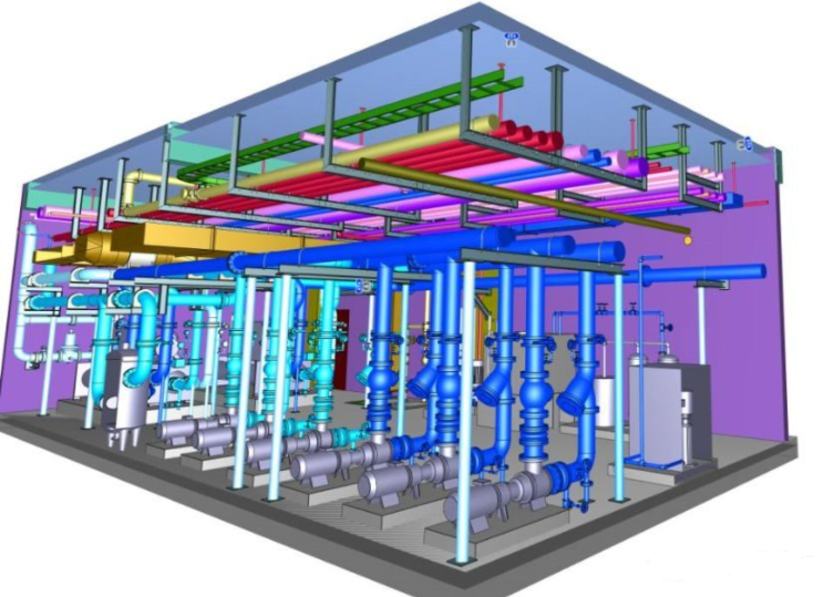 傳統(tǒng)的空調(diào)主機房施工需要1~2個月,而且機房內(nèi)施工人員密集,危險源較多。BIM技術(shù)與裝配式技術(shù)相結(jié)合,能實現(xiàn)將空調(diào)機房內(nèi)的設備及管路模塊化制造生產(chǎn),將傳統(tǒng)的1~2個月現(xiàn)場施工周期,縮短7~15天。同時降低現(xiàn)場施工危險源,提高施工效率。