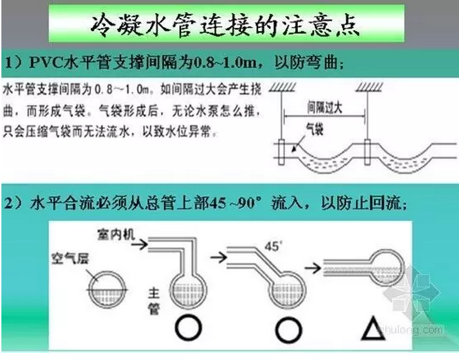 注意事項(xiàng):1.合理選擇空調(diào)排水管管道的長(zhǎng)度。在設(shè)計(jì)管道時(shí),管道的長(zhǎng)度和坡度都應(yīng)適宜,否則會(huì)出現(xiàn)滴水現(xiàn)象。管道的安裝和布置要適合冷凝水的盡快排出,必要時(shí)可以設(shè)置水封裝置。