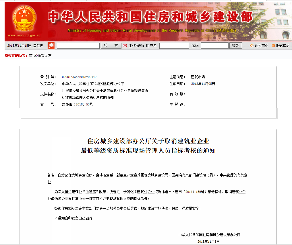 · 新資質(zhì)標準出爐!住建部關(guān)于取消建筑業(yè)企業(yè)最低等級資質(zhì)標準現(xiàn)場管理人員指標考核的通知