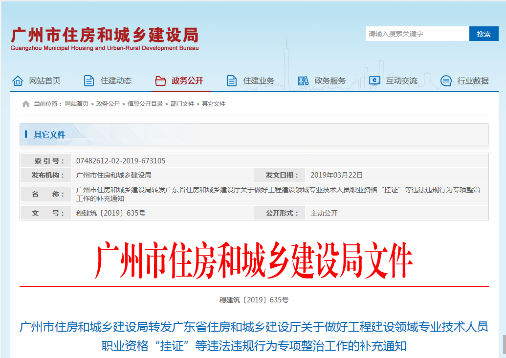 廣州市住房和城鄉(xiāng)建設(shè)局轉(zhuǎn)發(fā)廣東省住房和城鄉(xiāng)建設(shè)廳關(guān)于做好工程建設(shè)領(lǐng)域?qū)I(yè)技術(shù)人員職業(yè)資格“掛證”等違法違規(guī)行為專項整治工作的補充通知.