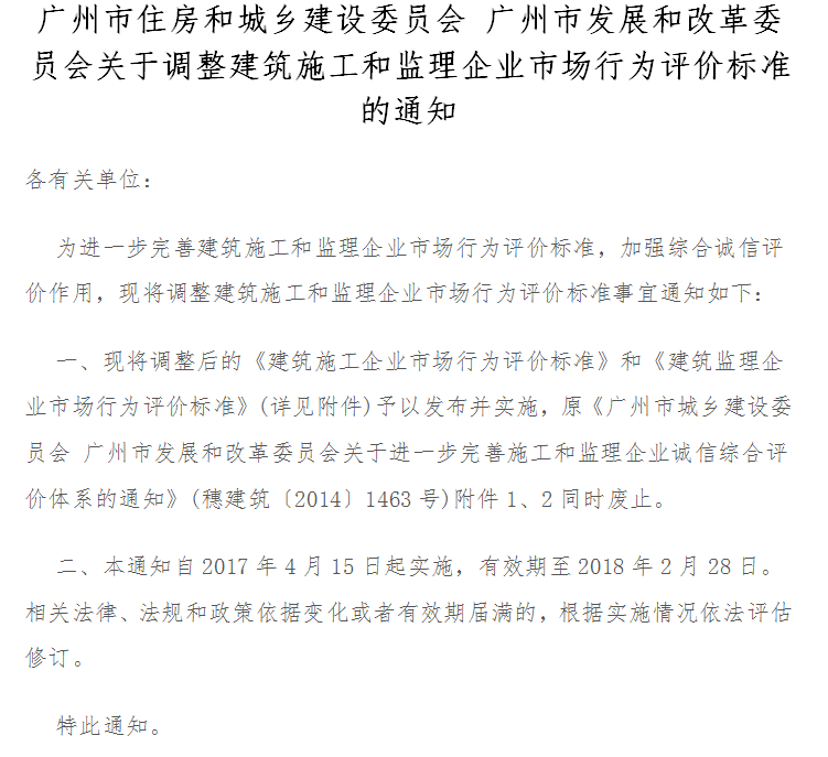 一、現(xiàn)將調(diào)整后的《建筑施工企業(yè)市場行為評價(jià)標(biāo)準(zhǔn)》和《建筑監(jiān)理企業(yè)市場行為評價(jià)標(biāo)準(zhǔn)》(詳見附件)予以發(fā)布并實(shí)施,原《廣州市城鄉(xiāng)建設(shè)委員會 廣州市發(fā)展和改革委員會關(guān)于進(jìn)一步完善施工和監(jiān)理企業(yè)誠信綜合評價(jià)體系的通知》(穗建筑〔2014〕1463號)附件1、2同時(shí)廢止。